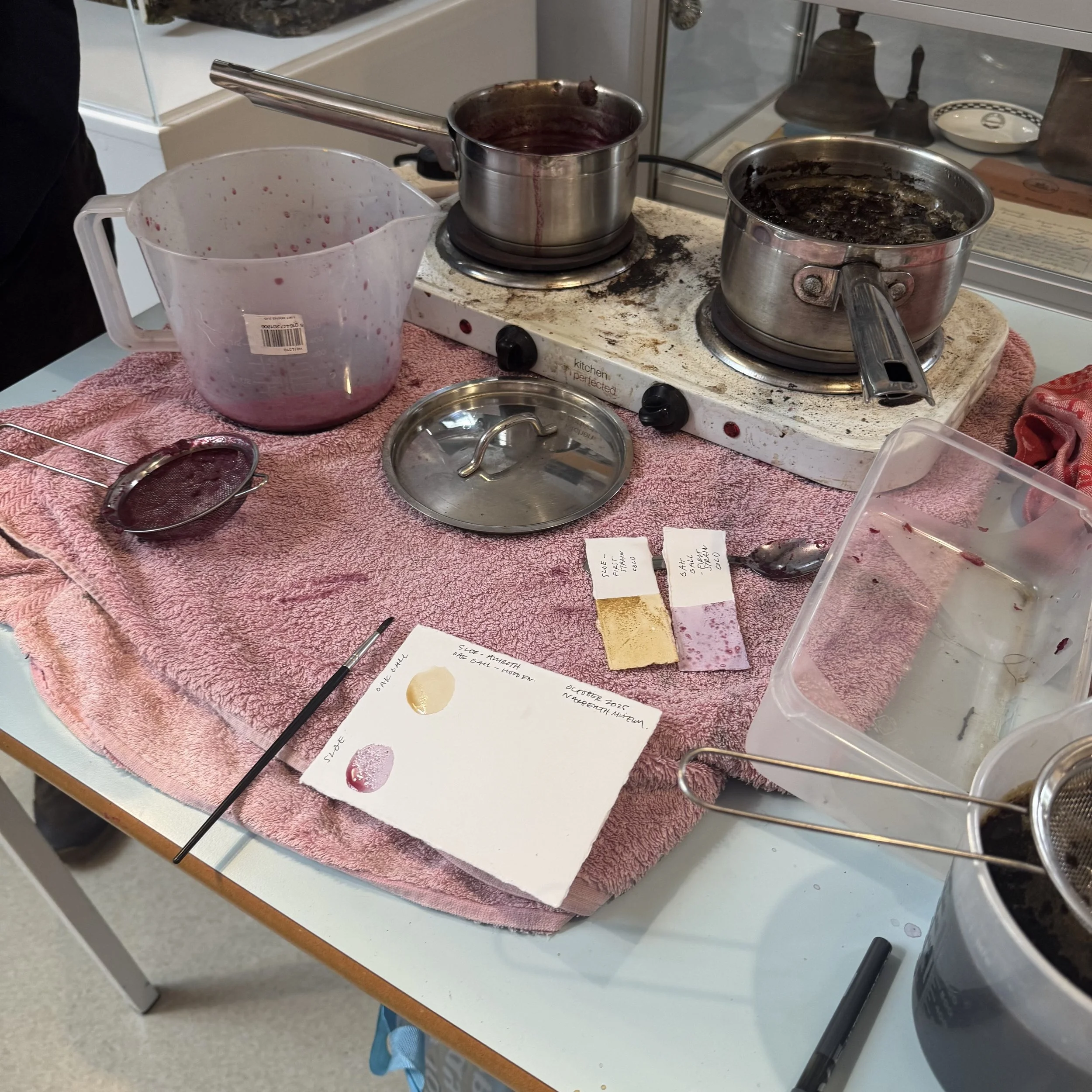1 pot of oak galls and 1 pot of sloe berries bubbling away nearly ready for us to make natural inks from.
